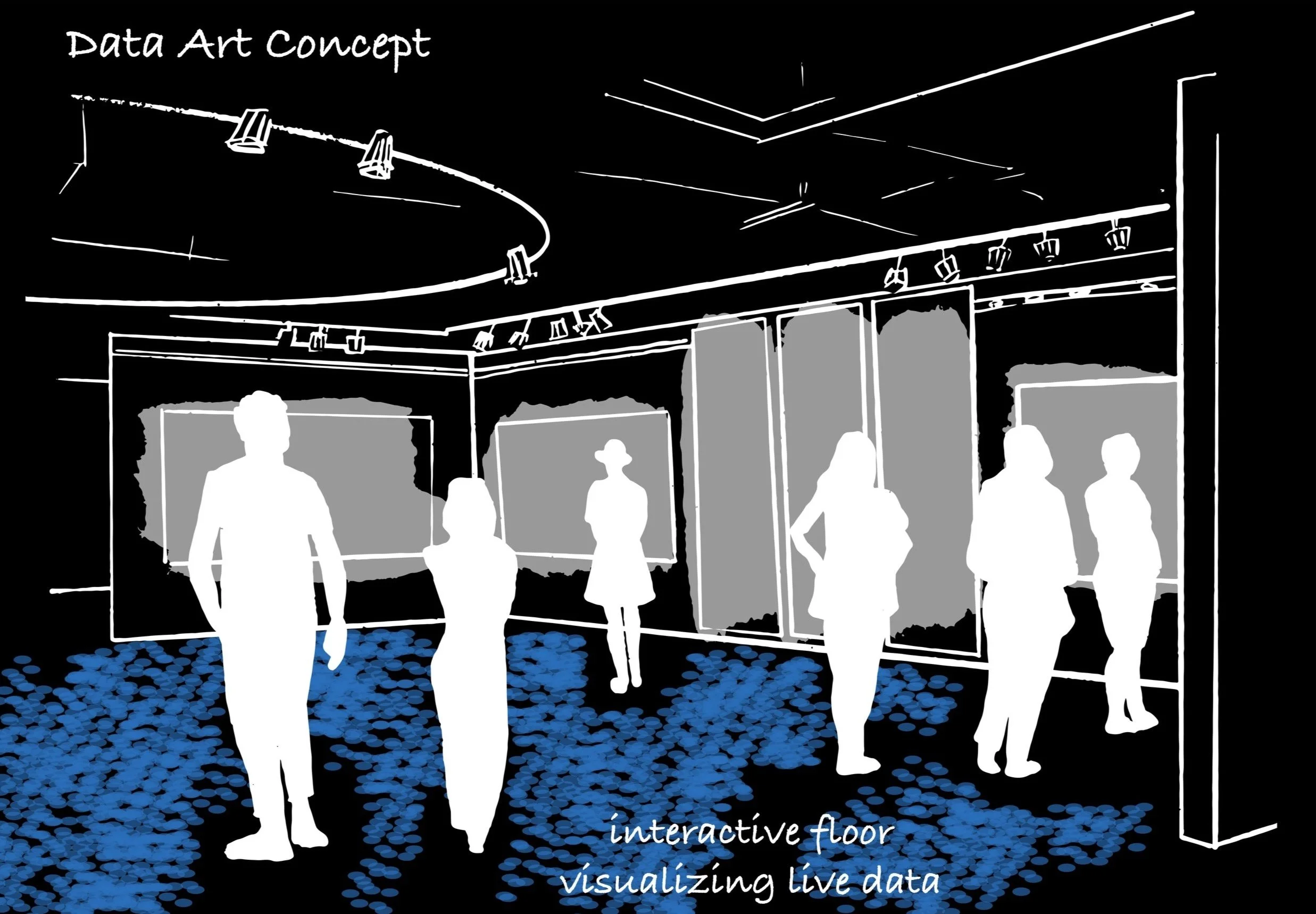 The final data art concept consisted of two elements: the interactive floor display and the physicalization of the data through a limestone wall fountain, both connected to the same data.